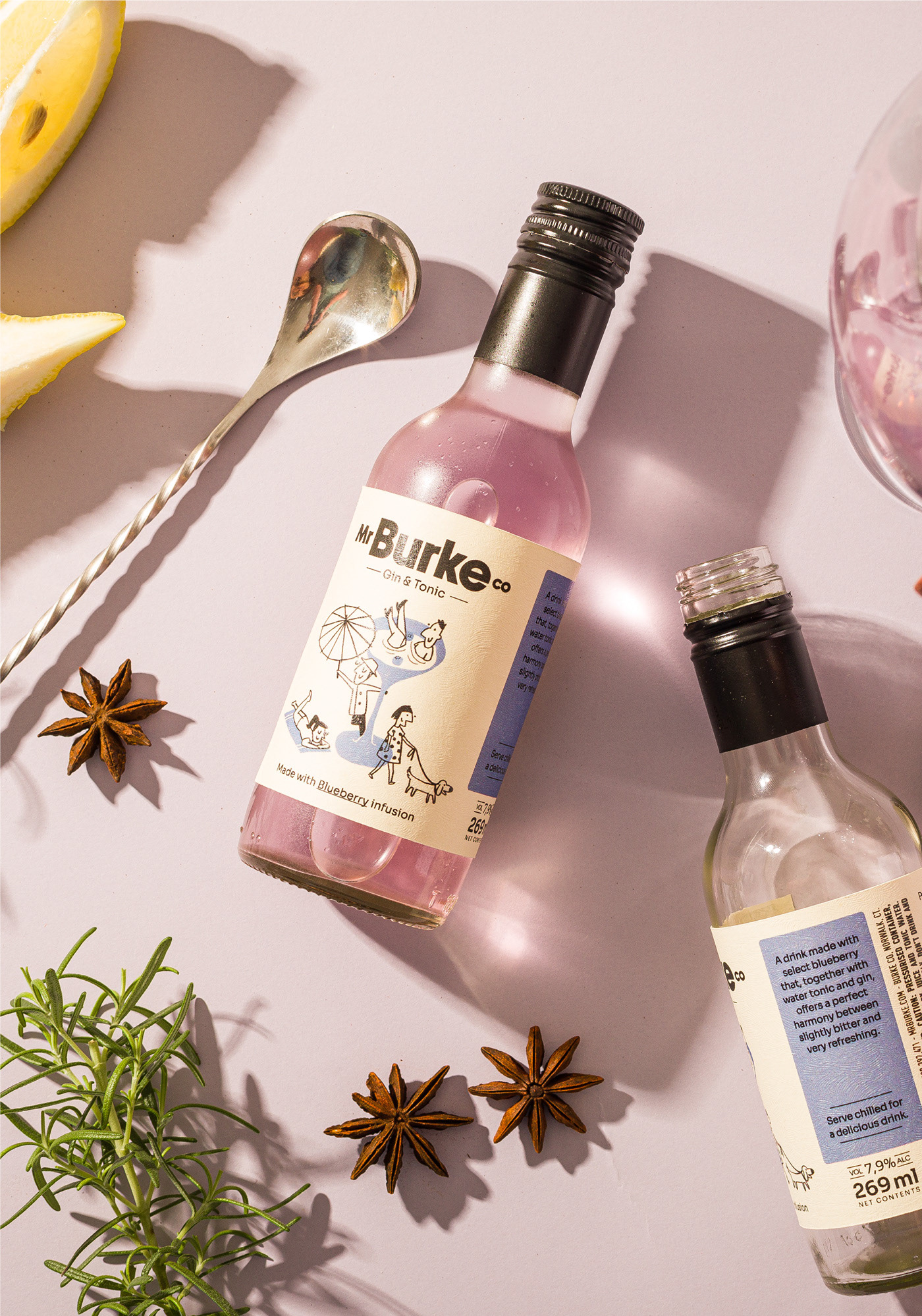 Mr. Burke Co is a Gin & Tonic ready to drink with lots of irony. I developed two sets of illustrations to represent it's relaxed and sarcastic personality, as well as the flavors lemon and blueberry.