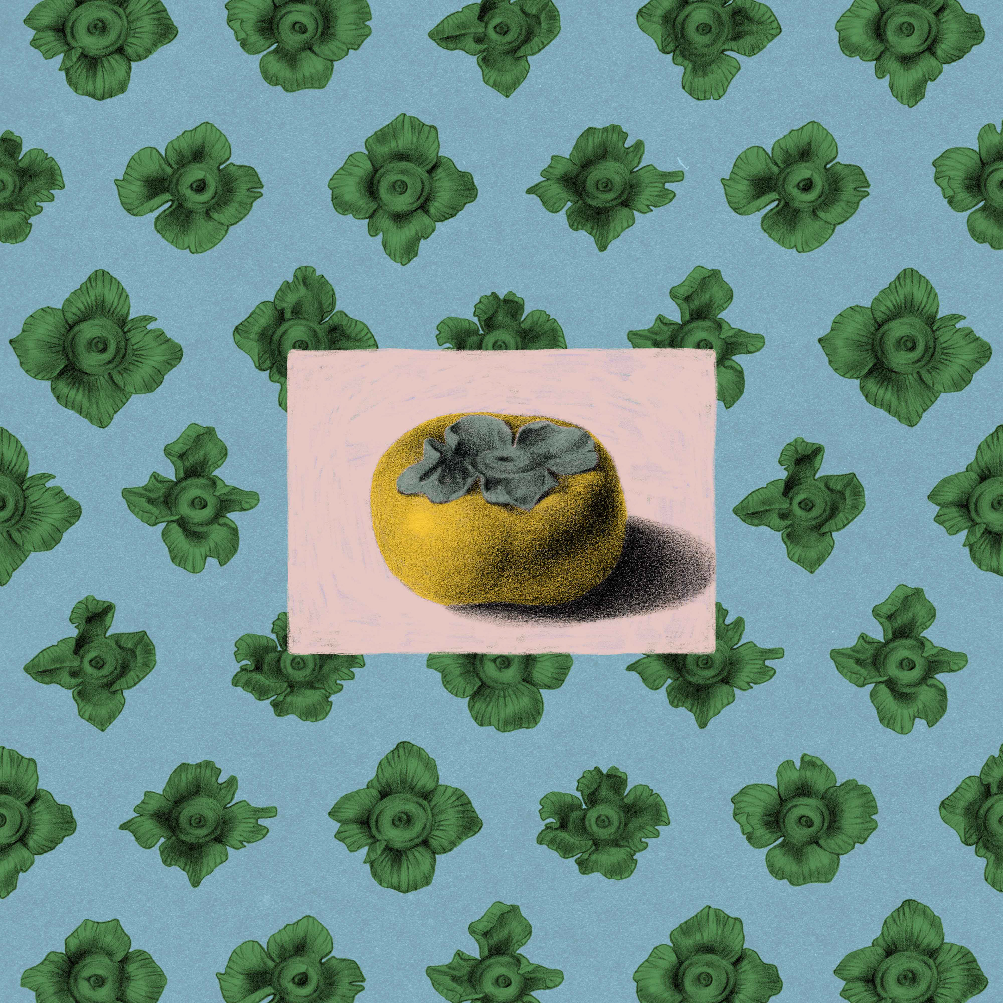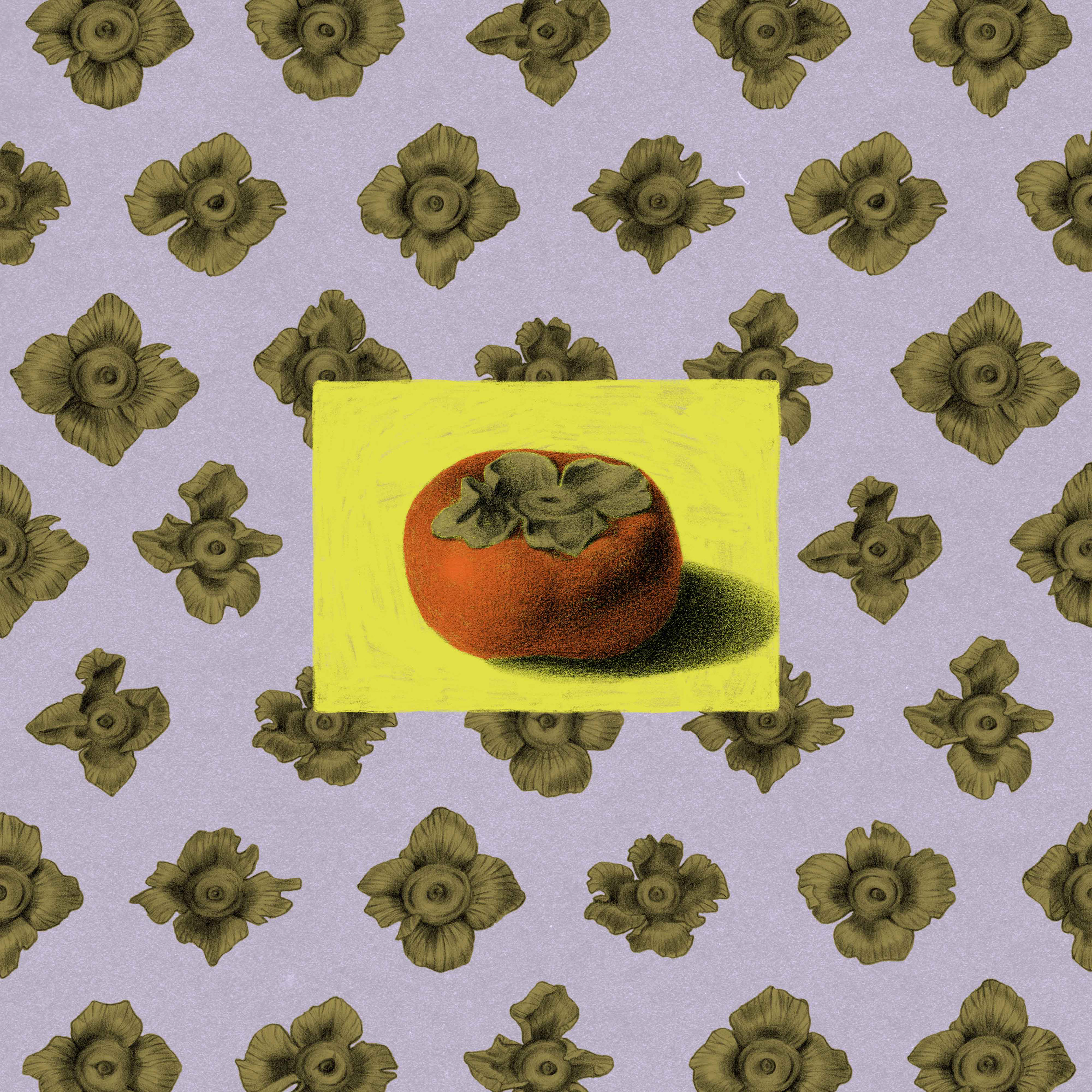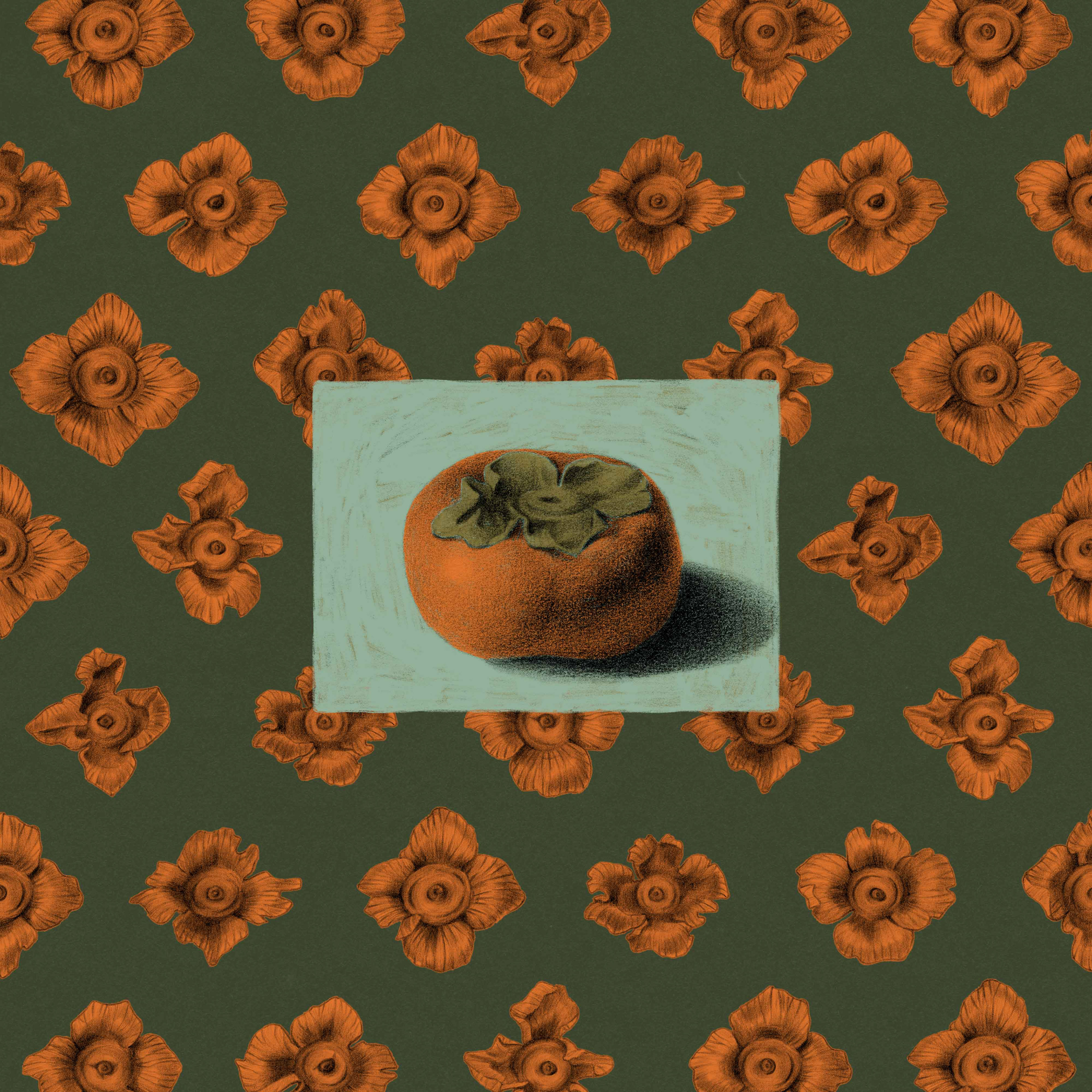 Illustration and pattern design. I've noticed that persimmon leaves are really beautiful and have such an interesting shape so I decided to make a pattern out of it. I drew a persimmon and variations of the leaves then assembled it digitally.